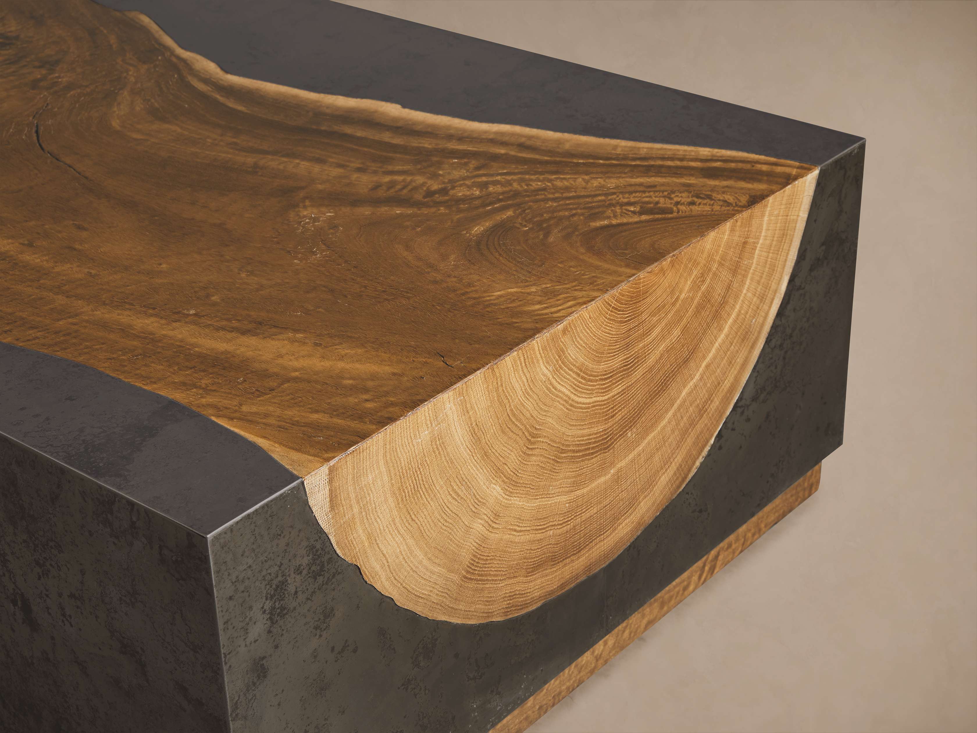 Panels of weathered steel mold around silhouettes of yukas, celebrating organic imperfection.